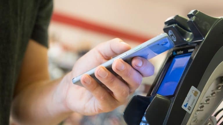 Das Bild zeigt eine moderne Zahlungsszene, in der eine Person eine kreditkarte an ein kontaktloses Terminal hält, während ein Smartphone mit digitaler Zahlungsfunktion daneben liegt.