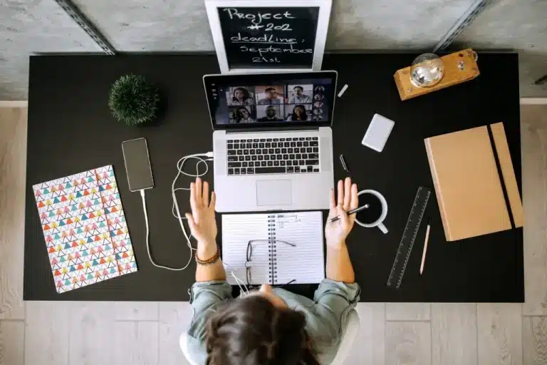 Workspace with laptop, notebook, cash and phone on wooden desk, illustrating budgeting tipps and financial organization at home.